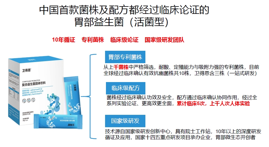 優(yōu)勢(shì)特點(diǎn):首款臨床級(jí)配方的胃部益生菌,10年循證,靶