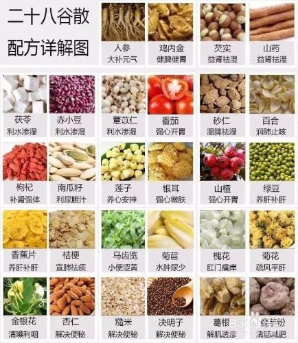 二十八谷散由28位配方組成:其中主料18味,輔料10味。主料包含:雞內金、赤小豆、薏苡仁、芡實、山藥、枸杞、南瓜籽、蓮子、百合、銀耳、香蕉片、金銀花、菊花、馬齒覽、菊苣、葛根、魔芋粉、糙米。輔料包含:茯苓、桔梗、綠豆等。由于種類繁多不一一列出了.二十八谷散是目前去濕氣類產品中集大成者。